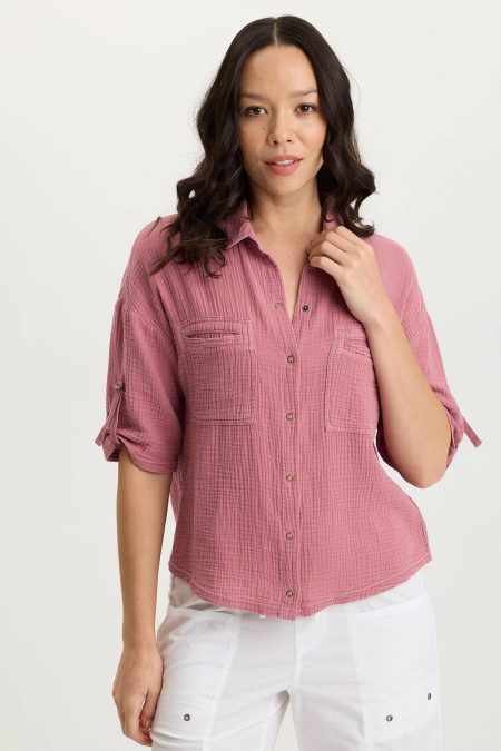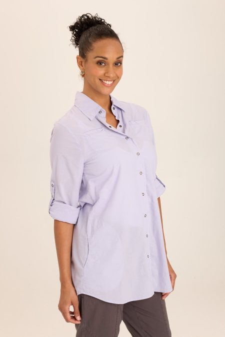 A classic XCVI body brought back to delight with a long tunic style silhouette and a snap-up front closure. Featuring rollable tabbed sleeves, two welt breast pockets and a yoked back pleated panel. Cotton Voile: 100% Cotton. Center Front: ~29.5″ Center Back: ~30.25″ Color Description: Light pastel purple Preshrunk Machine…