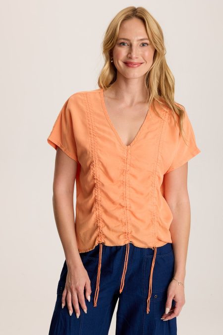 Two curved channels created with adjustable cords offer customizable ruching to this contrast-fabric style. A twill front body creates dynamic texture and movement-friendly stretch when paired with a Slub Jersey back, sleeves, and trim at the v-neck. Soft Twill: 100% Tencel Effie Slub Jersey Contrast: 60/40 Cotton/Modal Center Front (~in):…