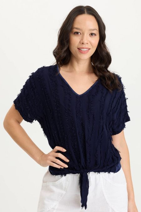 Curine V-neck has a tie front and a slightly oversized silhouette. Featuring a shredded stripe voile and a slub jersey contrast back. Rudis Stripe Voile: 100% Rayon Effie Slub Jersey Back Panel: 60/40 Cotton/Modal Center Front (~in): ~14.5″ Center Back (~in): ~21″ Color Description: Bright Navy Preshrunk Machine washable Imported…