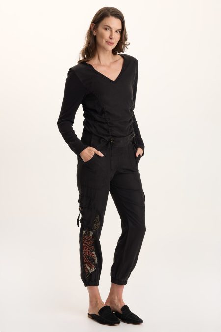 Sequined looped flowers decorate the front of this traditional “button-up” style top. With brass buttons and a raw edge, fun starts now! Soft Twill: 100% Tencel. Center Front: ~20″. Center Back: ~22″. Color Description: A classic midnight black. Preshrunk. Machine washable. Imported. MODEL Hunter is wearing size Small. Height: 5’10” |…