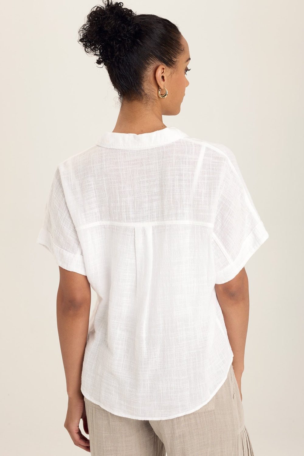 We can’t get enough of tie front tops! Here is a classic tie front button-up. Cuffed short sleeves, tortoise buttons and a curve back hem with a box pleat make this style a must have!