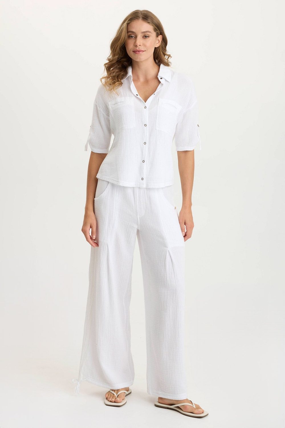 A snap-up front with a contrasting slub jersey back panel is all the rage in the Maurise Top. Featuring two welted breast pockets, tabbed short sleeves, mesh trim inserts and a back pleat.